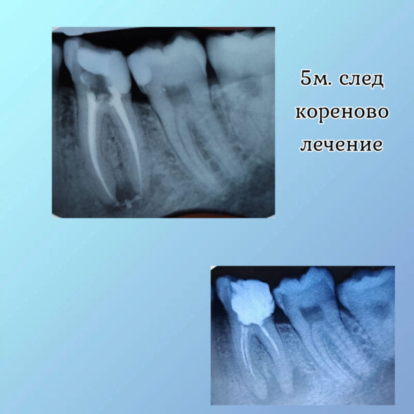 Пациент на възраст 18г. посети кабинета след консултация с хирург за екстракция на долен шести зъб с диагноза гранулом. След проведена консултация, беше взето решение за започване на ендодонтско релечение, с цел да опитаме да запазим зъба. Лечението се проведе в 3 посещения и зъбът беше запълнен финално. Контролната рентгенография е направена 5 месеца след ендодонтското лечение. Предстои направа на постоянно изграждане на зъба.