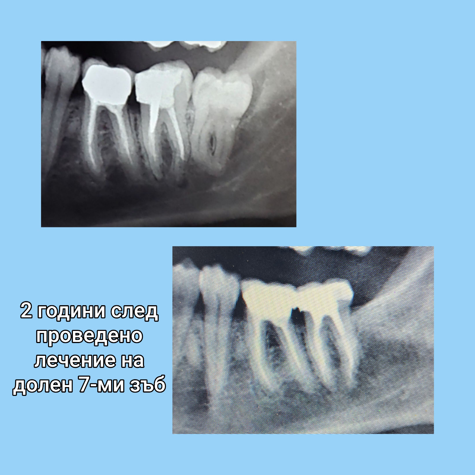 Пациент на възраст 35г. бе установено наличие на гранулом на зъб с безсимптомно протичане при направа на рентгенова снимка с цел екстракция на мъдрец. Лечението беше проведено в 3 посещения. Последната контролна снимка е направена 2 г. след лечението и се вижда пълно оздравяване на гранулома.