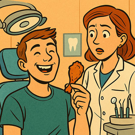 Пациентът пристигна с усмивка и леко чувство на гордост. Разказа, че предния ден е празнувал рождения си ден. Излязал с приятели да хапнат любимите му крилца и изведнъж – усеща, че нещо липсва. Не в менюто, а в устата му.